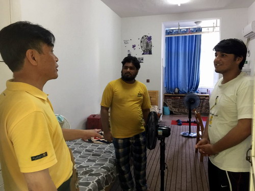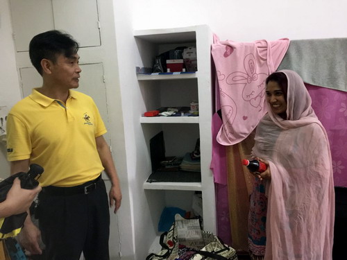 杨副校长一行首先来到留学生宿舍公共场所,看到窗明几净、楼梯走道卫生良好,杨副校长感到满意。随后杨副校长走进留学生宿舍,见到室内整洁、卫生,井然有序,部分留学生正在学习网上课件,杨副校长一行感到满意。杨副校长叮嘱留学生要注意防暑,保持宿舍干净卫生,注意用电安全,不在宿舍内做饭;假期外出或回家注意交通安全,到家后要向国际交流学院老师报平安;并为每位留学生送上暑期清凉饮料。最后,杨副校长还鼓励在校留学生利用假期好好学习语言和专业知识,更多了解中国文化,过一个充实有意义的暑假。留学生们深深感受到了学校对他们的关注和关怀。杨校长还嘱咐国际交流学院管理人员注意假期留学生宿舍设备维护,一再强调宿舍安全管理是头等大事,不能马虎,及时向有关部门反映维修问题,如窗户安装防护栏、宿舍大门低洼积水排泄和下水道污水排放等问题。