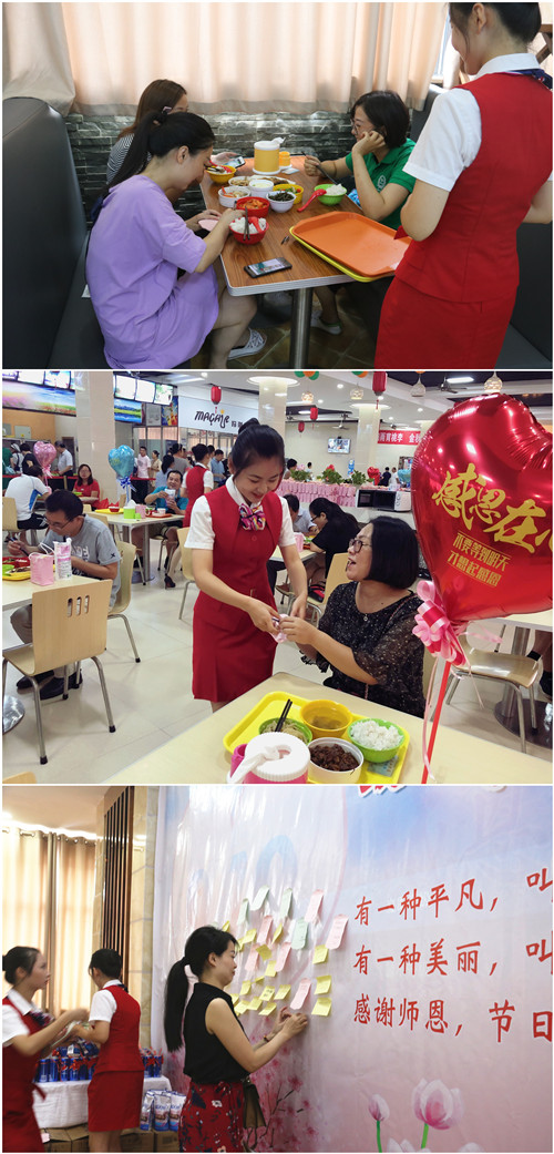 据悉,为喜迎教师节,后勤管理处提前准备,精心策划,前期做了大量的师生调研,真正想为全体教师呈现一个难忘的教师节。教工食堂的第一活动现场之外,学生食堂也在第一时间开展了丰富多彩的节庆活动,虽然形式各异,但都主题突出,均表达了同品节日喜悦,共叙育人情怀,畅想美好未来的美好心愿,后勤管理处希望通过教师节的活动表达对辛勤耕耘在教学科研第一线的教职工们的感谢和关怀。