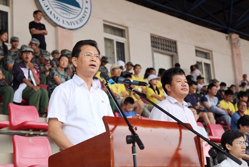 军训总结表彰大会结束后,随即进行了开学典礼。校长刘晓东作了热情洋溢的讲话。他首先代表党政及全体教职工对2018级新同学表示热烈的欢迎,对承担军训训练任务的武警九江支队表示衷心的感谢。他指出,大学是人生的新起点,也是求知求学,成才成人的关键阶段,一定要好好珍惜和把握,认真探索和体验。你们选择了一所有历史、有规模、有特色、有潜力的大学。学校坐落于中国魅力城市九江,这里地理位置得天独厚,地处庐山之麓、长江之滨、鄱湖之畔;这里历史文化底蕴深厚,是东晋田园诗人陶渊明、北宋“江西诗派”宗师黄庭坚、近代国学大师陈寅恪的故乡,李白、白居易、苏轼等历代文豪都曾在这里留下光辉的足迹和不朽的诗篇,白鹿洞书院更是开启了千年高等教育的历史,这里自古以来就是文人雅士读书修行的圣地。相信你们在九江学院将亲身感受到“登高壮观天地间,大江茫茫去不还”的豪迈情怀;感悟到“不识庐山真面目,只缘身在此山中”的人生哲理;领略到“长恨春归无觅处,不知转入此中来”的生命惊喜。刘校长给同学们提出了三点希望。第一,要心怀天下,无愧于国。希望同学们在今后的求学生涯中,树立远大理想、心系家国情怀,牢记国家之需,努力使自己成为对国家、对民族、对社会有益的合格人才;第二,要砥砺品质,无愧于人。大学阶段是人格品质形成的重要阶段。希望同学们要坚守道德和良知的底线,承担起更多的时代责任,努力使自己成为道德高尚、意志顽强、人格健全的人;第三,要惜时好学,无愧于己。大学生活丰富多彩,但也短暂易逝,希望同学们时刻牢记“竞知向学”的校训,珍惜时光,奋发图强,为实现人生理想、报效祖国奠定坚实的基础。