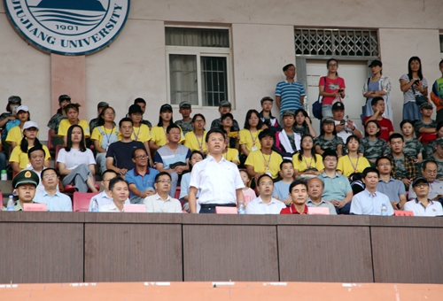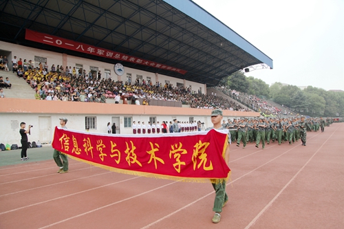 上午8时30分,升旗仪式正式开始,2018级新生军训总结表彰大会在庄严的国歌声中拉开了帷幕。升旗仪式结束后,校长刘晓东郑重宣布:九江学院2018级新生分列式汇报表演开始。