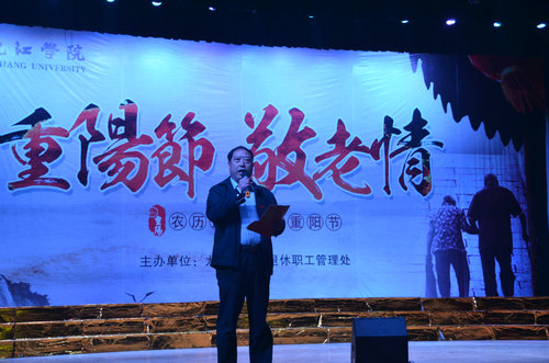 离退休职工管理处处长燕红波致辞,他祝福老同志健康、幸福、快乐、长寿,他还简要传达了校党委书记赵伟在学校首次党代会上作的《不忘初心牢记使命 奋力谱写新时代九江学院发展的新篇章》主题报告精神。