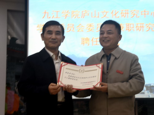 庐山文化研究中心兼职研究员代表杨学富教授在会上就兼职研究员的责任和自己的研究设想作了热情洋溢的发言。