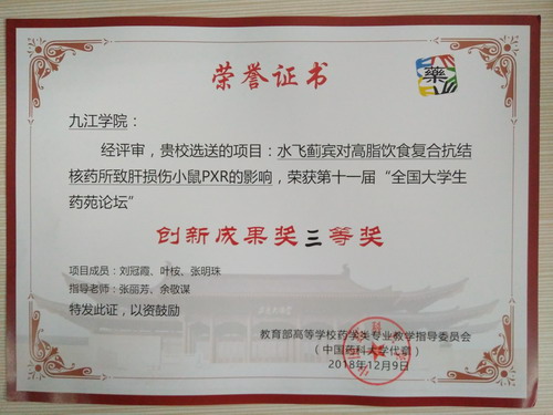 本次论坛分为“专家报告”、“分组汇报答辩”和“学生成果壁报交流”等模块,参赛作品经过壁报展示、论文评审、现场汇报、现场提问以及论坛委员会评议等环节,按照原创性、规范性、创新性的原则评选了优秀壁报奖、优秀论文奖和创新成果奖三类奖项。经过激烈角逐,永利yl23411集团官网药生学院由张丽芳和余敬谋老师指导、2015级药学专业刘冠霞等同学完成的《水飞蓟宾对高脂饮食复合抗结核药所致肝损伤小鼠PXR的影响》项目获得创新成果三等奖。