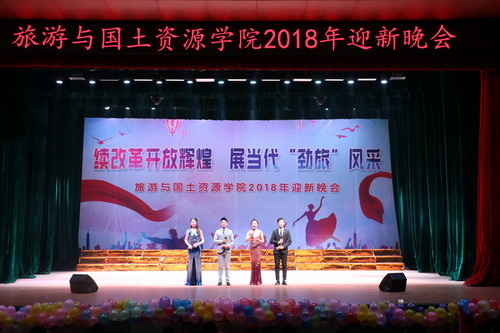 续改革开放辉煌,展当代“劲旅”风采。12月12日晚,旅游与国土资源学院在主校区大礼堂成功举办2018年迎新晚会。副校长陈春生,党委委员、宣传部长冯建,学院党政领导及全院师生观看了本场晚会。