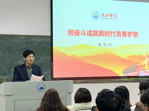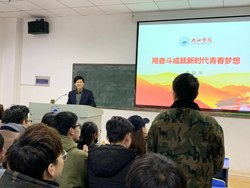 课堂上,查副校长以九江交响乐团的排练和演出为切入点,结合自身的求学经历,与同学们展开“新时期我们应该做一个怎样的大学生”的讨论。查副校长以中央电视台《复兴之路》、《守望》等视频,用赣东北革命根据地先烈方志敏的故事以及歌曲《十送红军》的创作过程等详实丰富的资料,引导同学们要怀抱梦想,不做一个“人云亦云的吃瓜群众”;要有信仰,做一个品格高尚的时代青年;要有“不扫一屋何以扫天下”的担当精神,脚踏实地地做一个有作为的新时期大学生。