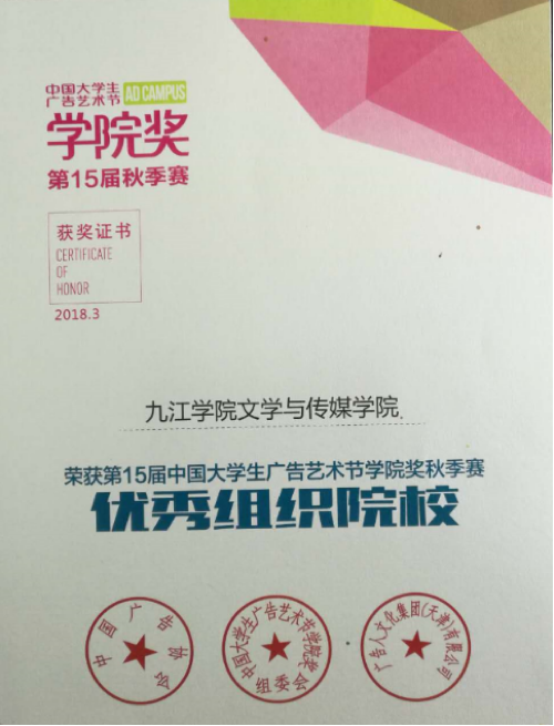 日前,第十届(2018年度)全国大学生广告艺术大赛(江西分赛区称为“江西省大学生科技创新与职业技能竞赛-广告与艺术大赛”)落下帷幕,获奖作品证书已经全部到校,文学与传媒学院成绩显著,获得多项国家级、省级奖项。