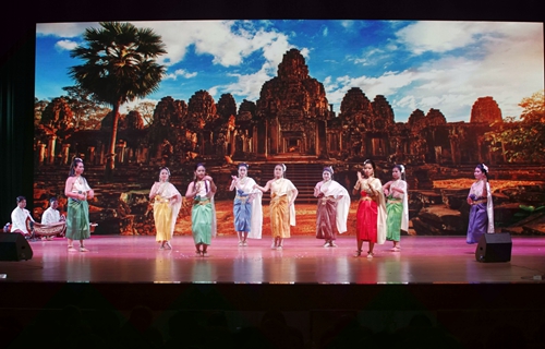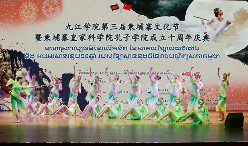 晚会上,来自柬埔寨的艺术家们和九江学院的柬埔寨留学生,为大家展现精彩绝伦的古典高棉艺术。柬埔寨皇家科学院代表团带来了《孔雀舞》、《敲椰壳舞》、《美人鱼舞》、《耕祭舞》,九江学院的柬埔寨留学生们表演了《淑女舞》、《笙舞》、《水布舞》,这些富有高棉特色的舞蹈,呈现了柬埔寨人民沟通交流、祭拜神灵、感恩自然、庆祝节日等场景。柬埔寨的艺术家演奏了四种柬埔寨传统乐器,或深沉,或细腻,或委婉的曲调,使观众感受到了浓郁的古典高棉文化气息。