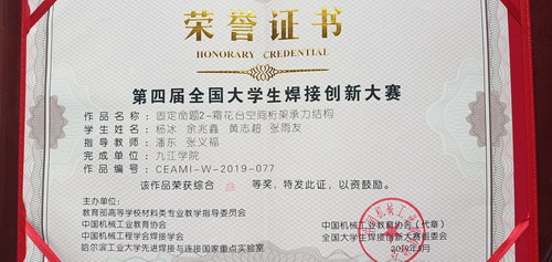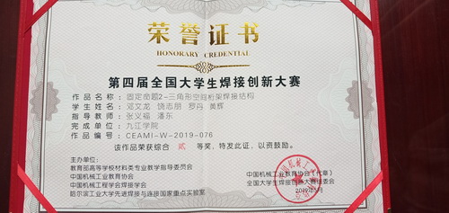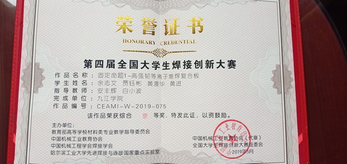 经过性能测试、答辩等环节的激烈角逐,由余志文、贾钰彬、黄漫华、黄进完成的《固定命题1-高强韧等离子堆焊复合板》(指导教师:安丰辉、白小波)荣获一等奖,由邓文龙、饶志朋、罗丹、黄辉完成的《固定命题2-三角形空间桁架焊接结构》(指导教师:张义福、潘东)荣获二等奖;由杨冰、余兆鑫、黄志超、张雨友完成的《固定命题2-霜花台空间桁架承力结构》(指导教师:潘东、张义福)荣获三等奖。