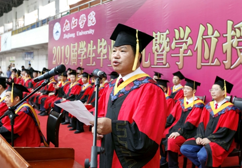 刘晓东回顾了2019届毕业生与九江学院一起成长的点滴时光。他说,几年来,我们共同努力创造了学校事业跨越发展的新局面,你们也将最美好的年华留在了九院。今夕,愿你们不负芳华,无问西东。刘晓东说,作为新时代青年,同学们生逢盛世,即将成为新时代的建设者,今年又是新中国成立70周年,同学们在这个特殊的年份学成毕业,恰逢其时。数年学海泛舟,今朝志在四方,刘晓东对同学们提出四点希望:第一,要长存家国情怀,勇于担当使命;第二,要勇于砥砺奋斗,敢于面对挑战;第三,要勤于学习实践,练就过硬本领;第四,要严于律己修身,锤炼高尚德行。他希望同学们始终保持严于律己的生活态度和高尚的道德追求,树立正确的人生观和价值观,自觉养成明德惟馨、择善而从的行为习惯,比如:积极向上、爱岗敬业、廉洁诚信、遵守秩序、尊重弱者、敬畏自然、厉行节约等等;始终恪守道德信仰、坚守正直善良,追求公平正义、引领道德风尚,努力成为践行社会主义核心价值观的示范者!衷心祝愿同学们在实现中华民族伟大复兴波澜壮阔的历史洪流中,大显身手、大展宏图!衷心祝福2019届全体毕业生前程似锦、生活幸福、一生健康平安!