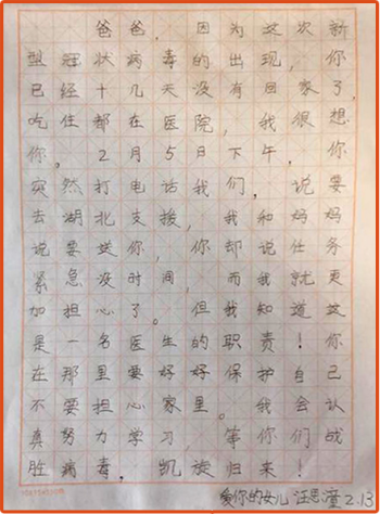 “爸爸:因为这次新型冠状病毒的出现,你已经十几天没有回家了,吃住都在医院,我很想念你。2月5日下午,你突然打电话我们,说要去湖北支援,我和妈妈说要送你,你却说任务紧急没时间,而我就更担心了。但我知道这是一名医生的职责!你在那里要好好保护自己……,等你们战胜病毒,凯旋归来!”