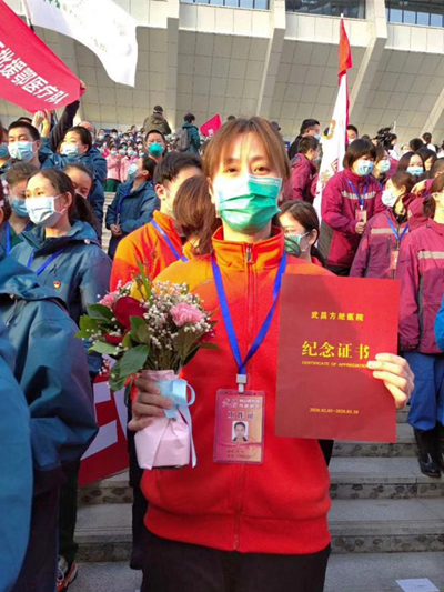在这支队伍当中,有来自九江学院附属医院第二批支援湖北医疗队员——殷美霞和章婷。从2月7日凌晨两点起,她们正式进入洪山体育馆方舱医院,作为九江支援湖北护理队队长、江西护理医疗队护理组长,殷美霞、章婷带领着她们各自护理团队,每天为160多位新冠肺炎患者进行医疗护理工作。3月10日下午3点半,随着最后一批49名患者从方舱医院治愈出院,运行了35天的武汉市首个方舱医院正式休舱,在这35天里,殷美霞、章婷所在的“江西护理队”方舱C区共收治282名患者,她们的“江西护理排班模式”被制定成模板推广到了青海、广西、河北等医疗护理队,她们被国家卫健委授予“全国卫生健康系统新冠肺炎疫情防控工作先进集体”称号,被江西省妇联授予“江西省三八红旗集体”称号。殷美霞因在疫情防控斗争中表现突出,获中共九江市委组织部、九江市人力资源和社会保障局通报嘉奖。