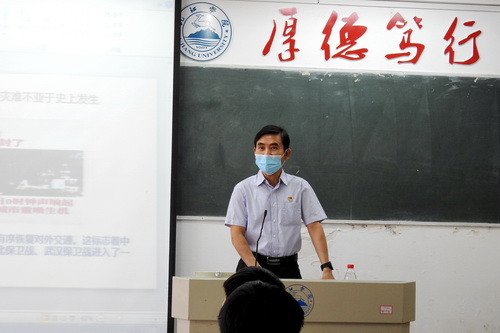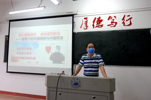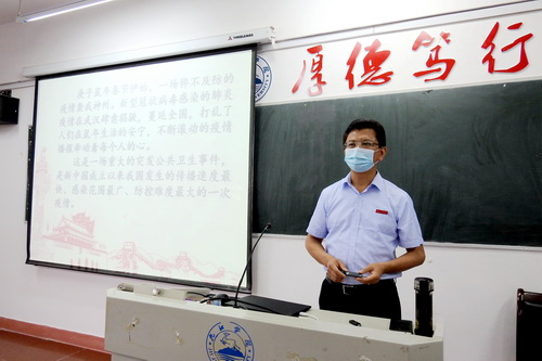 在竞知楼706教室,刘晓东校长以《在战“疫”中成长》为题,从战“疫”的动员、战“疫”的担当、战“疫”的启示三个方面为同学们上了一堂生动的思政课。他从许多生动鲜活的抗疫故事讲起,通过在抗击疫情中涌现出的大量生动的育人题材,通过中西抗“疫”模式对比,深刻诠释了中国精神与中国力量,鼓励大学生要从亲历中增强自信、在实践中贡献力量、从反思中收获成长,在宝贵的“疫情思政”大课中接受教育、挖掘经验、总结教训、弥补短板、获取力量。他指出,聚焦当下,放眼世界,没有任何一个国家能够像中国一样,以壮士断腕的勇气和决心,举全国之力积极抗“疫”,以最小的代价取得最大的胜利。