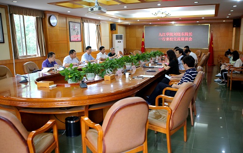 在交流座谈会上,湖南理工学院校长卢先明介绍了学校基本情况和办学特色。刘晓东校长介绍了九江学院基本情况和此次调研目的。刘晓东说,九江学院和湖南理工学院作为新建本科高校,具有许多相似性。一是地理位置相似:两所学校都位于长江之滨,大湖之畔,长江中游重要区域性城市节点上,校园环境美丽。二是历史背景相似:两所学校所在城市都有深厚的历史文化内涵,产业结构相近,九江学院办学历史可以追溯到1901年的但福德护士学校,湖南理工学院办学历史可以上溯到1910年的湖滨大学。三是发展历程相似:九江学院是2002年由九江财经高等专科学校、九江师范专科学院、九江医学专科学校和九江教育学院合并组建而成;湖南理工学院则是1999年由岳阳师范专科学校、岳阳大学、岳阳教育学院合并组建为岳阳师范学院,后于2003年更名而成。两所学校相似的发展历程使得两校具有共同的发展目标,湖南理工学院抢抓历史机遇,在硕士点建设、创新创业教育等方面走在了前面,对九江学院很有启发。希望借此次调研机会,推动两校互动交流,携手共进。