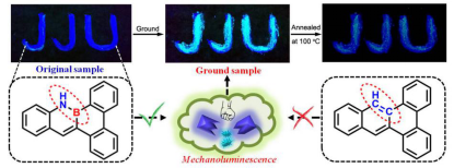 黄华南课题组通过合理的分子设计,巧妙地将硼氮单元引入传统芳香体系中,实现了一种新型有机力致变色发光分子的构筑(图二)。通过与其类似物对比研究,发现硼氮单元的引入可以有效的调节分子间相互作用力及堆积模式,进而实现其发光性能的调控。机理研究表明研磨前后分子堆积方式的破坏及有效系间穿越通道的改变是赋予分子力致变色发光性能的主要原因,为后期力致变色发光分子的构筑提供了一定的理论依据。
