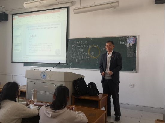 在文友楼412教室,《当代世界经济与政治》课堂上,余志权老师采用PPT与板书、小视频相结合的方式,生动形象、深入浅出地为文B1925班同学介绍了世界经济的构成、行为主体及运行机制。