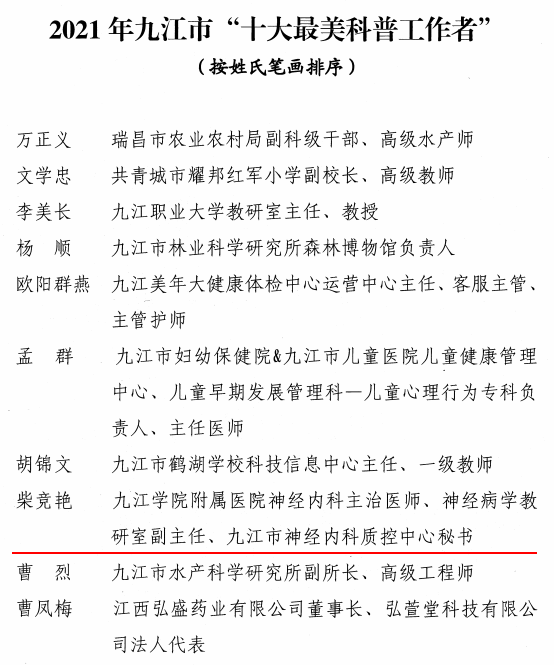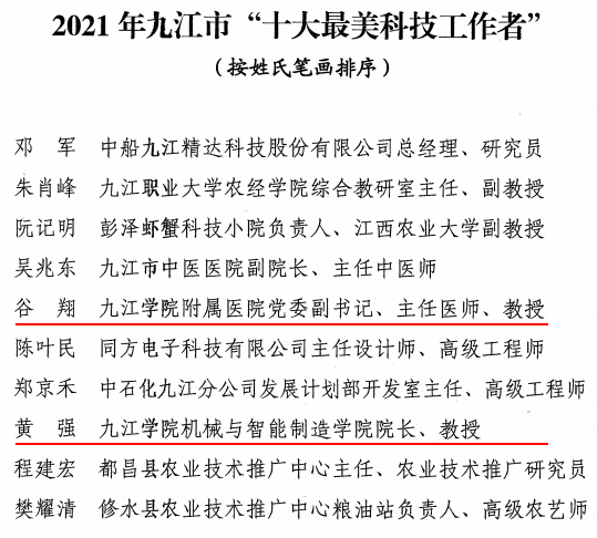 近日,中共九江市委人才工作领导小组办公室、九江市科学技术局、共青团九江市委、九江市科学技术协会联合下发了《关于选树2021年九江市“十大最美科技工作者”、“十大最美青年科技工作者”、“十大最美科普工作者”的决定》。永利yl23411集团官网教师谷翔、黄强、何刚、张化浩、柴竞艳获得九江市三个最美系列荣誉称号,其中黄强、谷翔荣评2021年九江市“十大最美科技工作者”,何刚、张化浩获评2021年九江市“十大最美青年科技工作者”,柴竞艳获评2021年九江市“十大最美科普工作者”。
