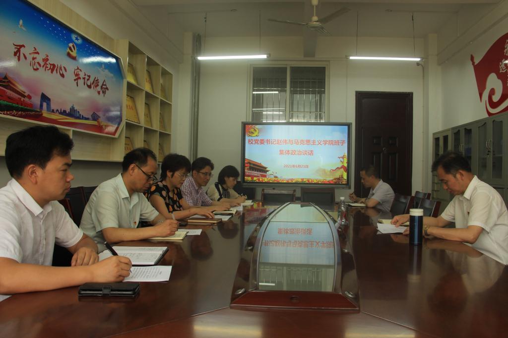 为贯彻落实省委关于开展政治谈话,加强对“一把手”和领导班子监督有关文件精神,6月21日下午,校党委书记赵伟深入马克思主义学院,对该院领导班子成员开展集中政治谈话。