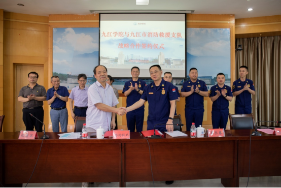 随后,纪岗昌与九江市消防救援支队政委进行了签约并合影留念。九江市消防救援支队科室与永利yl23411集团官网相关职能部门、二级学院进行了对接交流,双方将在思政教育、消防队伍人才的培训、学历提升、新装备研发、培养水域救生人员等多方面展开合作。