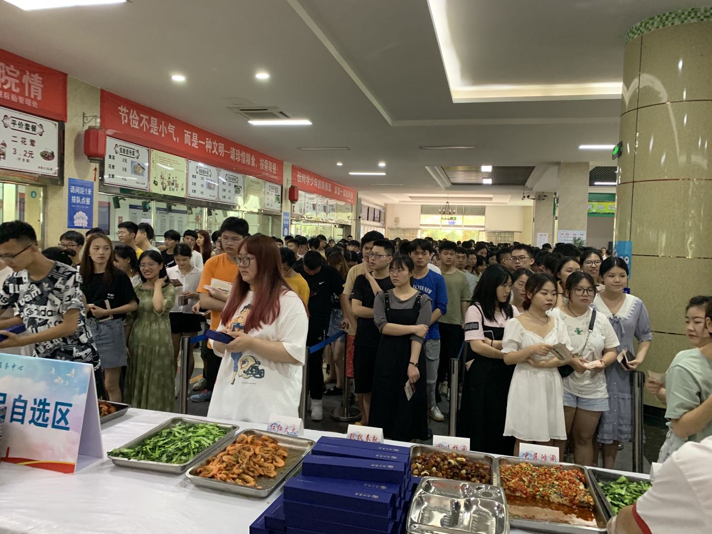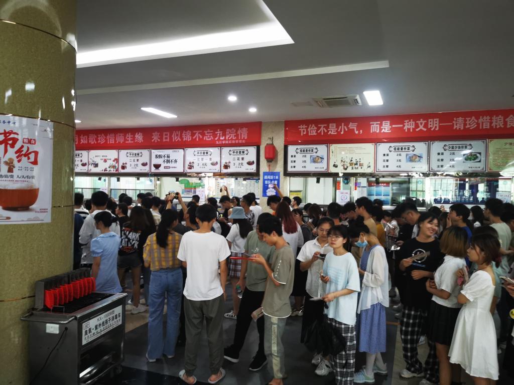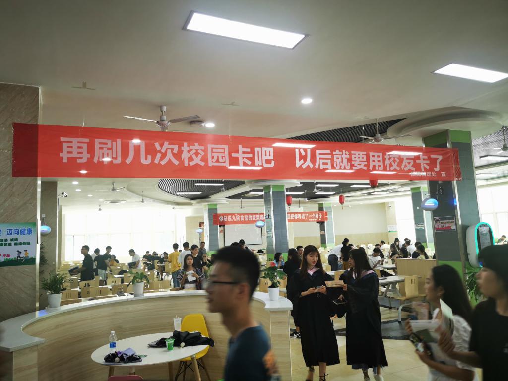 “再刷几次校园卡吧,以后就要用校友卡啦”、“毕业后的生活如果太苦,记得回母校加点糖”、“岁月如歌珍惜师生缘,来日似锦不忘九院情”,学生食堂一条条催泪的横幅,让毕业生们更加眷恋九院食堂的“美食美刻”。中午11点后,毕业生们陆续来到学生一、三食堂和浔东校区食堂。琳琅满目的菜肴已经摆满了餐台,鸿运满途(红烧肉)、青葱岁月(小葱豆腐)、片片情深(九江鱼片)、红红火火(白灼基围虾)等一道道充满寓意的菜肴,让学生们赞美又回味。同学们深情地举起大拇指为有情有味的九院点赞。