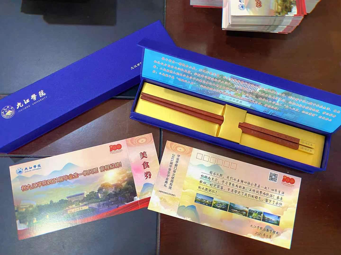 吃完毕业餐,每个毕业生还领到了一份最硬核的礼品。学校后勤管理处为毕业生们订制了九院版的筷子。筷子上方金色的九江学院字样熠熠生辉,筷体上“前程似锦,‘筷’意人生”的精美镌刻让同学们爱不释手。