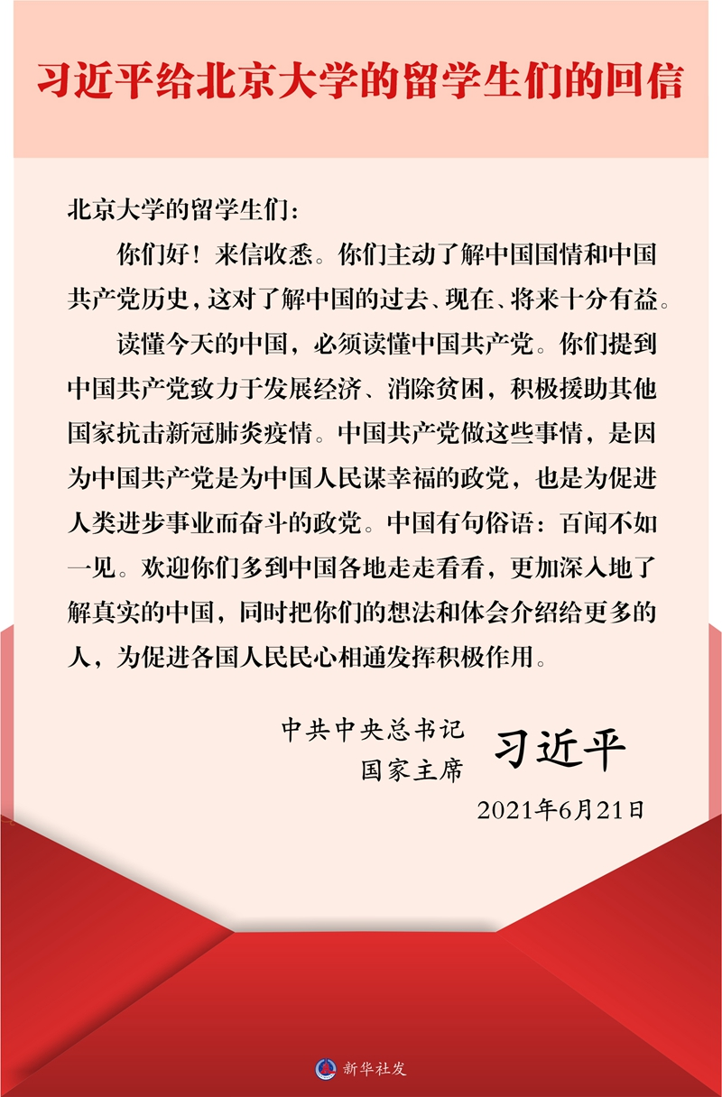 6月21日,中共中央总书记、国家主席习近平给北京大学留学生回信,鼓励他们多到中国各地走走看看,更加深入了解真实的中国,把想法和体会介绍给更多的人,为促进各国人民民心相通发挥积极作用。