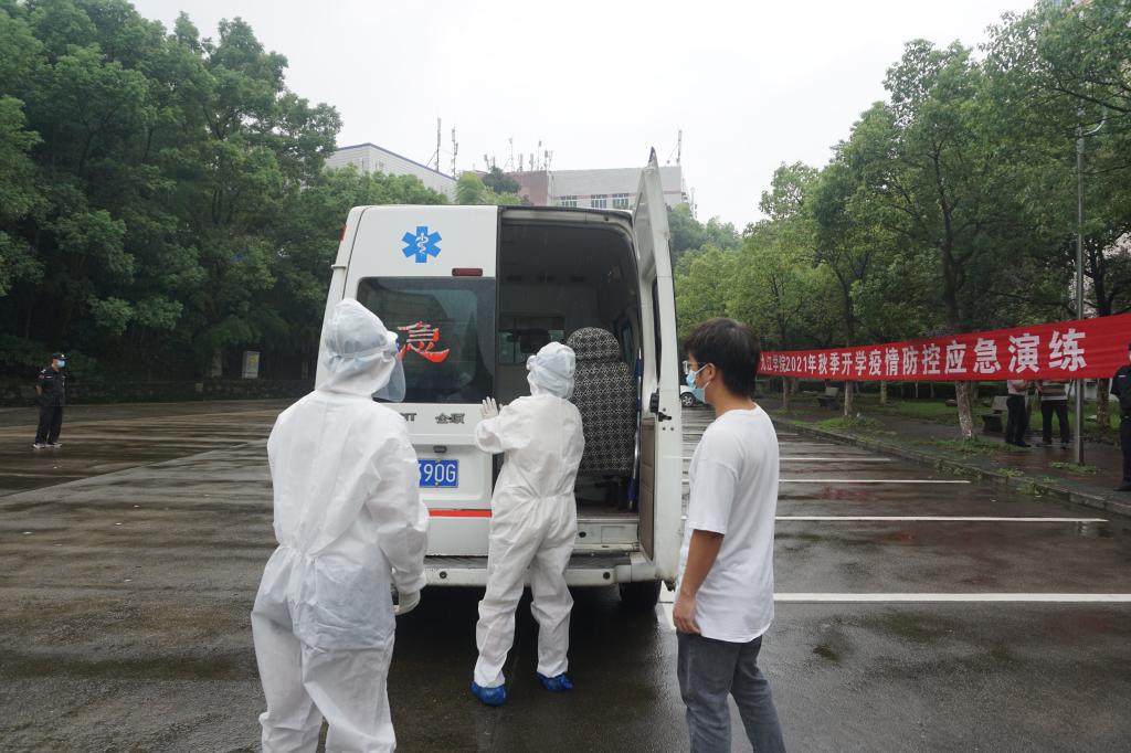 9点30分,疫情防控应急演练仪式在25栋宿舍楼旁边的小广场举行。校医院负责人介绍了本次疫情防控应急演练的经过流程、场景、具体细节和注意事项。校长陈小林宣布:演练正式开始。九江学院2021年秋季开学疫情防控应急演练进入真实场景:在25栋216宿舍,学生们正在认真学习,一个学生突然出现发烧症状,室友马上和辅导员取得联系,辅导员和校医院取得联系并及时赶到宿舍了解情况、安抚学生做好防护,按医护人员要求将学生引导到临时隔离点等待医护人员的到来。