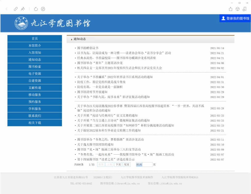 目前,九江学院图书馆馆藏纸质图书326余万册,电子图书175余万种,引进了CNKI、SCI、EI等中外文数据库100余个;年订购纸质期刊800余种,报纸50余种。为了深化信息服务维度,着力打造资源信息服务体系,图书馆还依据丰富的馆藏及网上资源,自建了“生态•鄱阳湖”、陶渊明文化研究等8个数据库。目前,基本形成了覆盖经济学、法学、教育学、文学、历史学、理学、工学、农学、医学、管理学等多个学科的文献资源保障体系。