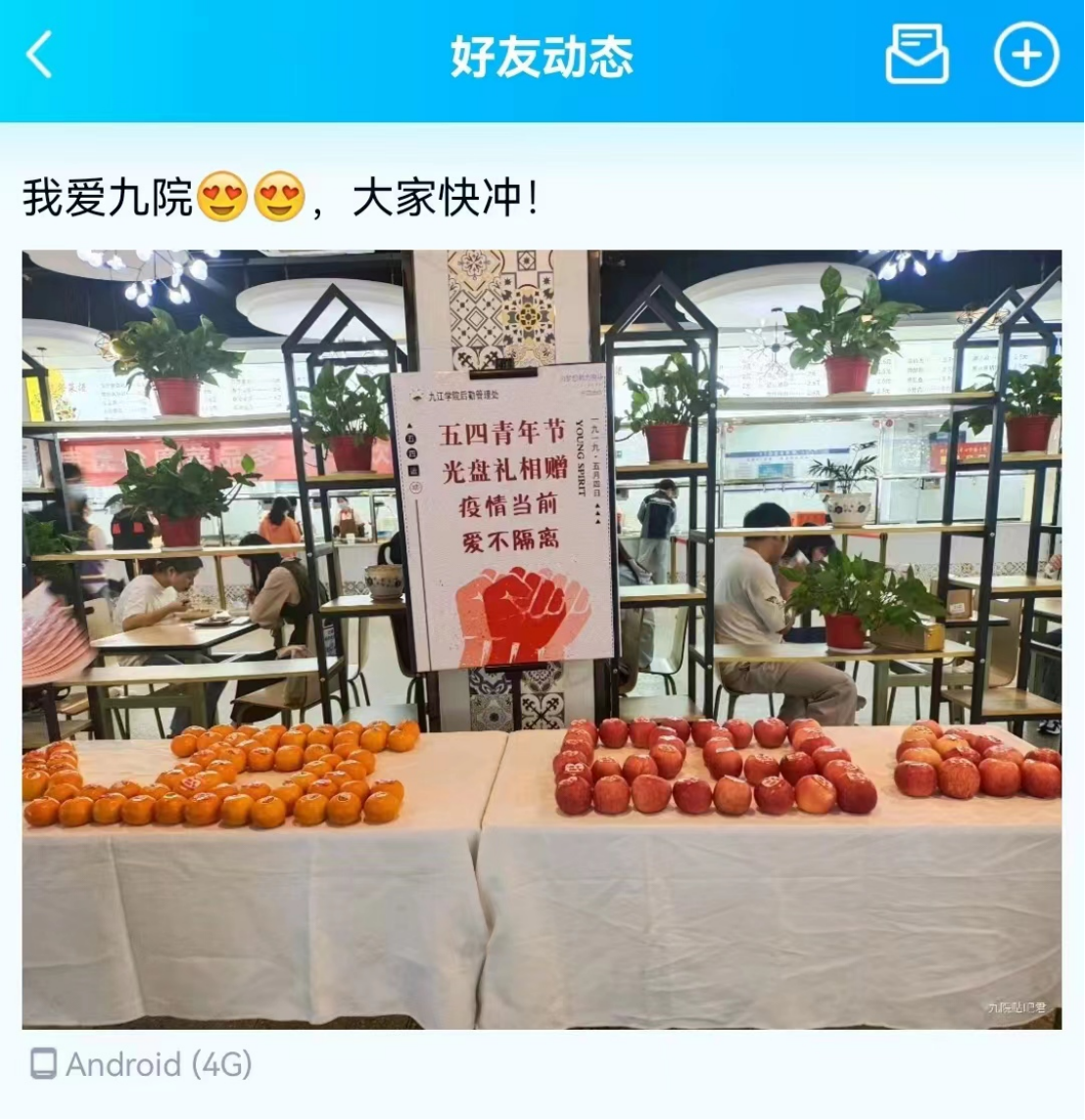 恰逢“五四”青年节,因为疫情防控原因,九江学院没有放假,为了能够让师生们安心、舒适、愉快地在学校过假期,后勤管理处从严从实从紧做好各项防疫工作,为师生健康和校园安全提供坚强保障的同时,也时刻在关心、关爱同学们的学习、生活和心理感受。“五四”青年节假期这几天,凡是在学校食堂就餐的师生们都能够享受光盘礼赠活动——吃饭光盘后免费领取柑桔、苹果等新鲜水果。九院后勤的这一光盘礼赠活动,让师生们深切感受到了学校的暖心和关爱。