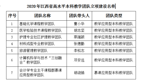 2020年我省发布《江西省高水平本科教学团队建设方案》,“十四五”期间,计划分两批遴选360个左右省级高水平教学团队并支持建设。根据《关于公布2020年江西省高水平本科教学团队建设名单的通知》(赣教高字﹝2021﹞20号),永利yl23411集团官网“基础化学课程教学团队”等7个教学团队获批2020年江西省高水平本科教学团队建设点,获批率位居全省前列。