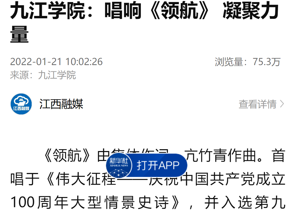 新华社客户端、大江网分别以《九江学院:创新主题党日活动探寻领悟中华传统文化》《九江学院:机关党支部创新主题党日活动·探寻领悟中华传统文化》为题报道,在学习优秀传统文化中汲取智慧和力量,不断增强党性修养,坚守为党育人、为国育才的初心。其中,新华社客户端目前浏览量达33万次数以上。今年5月,学习强国、江西思政以《九江学院:党史学习教育+传统文化浸润 推进机关学习型党支部建设》为题报道了近年来,九江学院机关党委以“党史学习教育+传统文化浸润”为主题,创新支部活动形式,大力营造和形成重视学习、崇尚学习、坚持学习的浓厚氛围的各项活动。