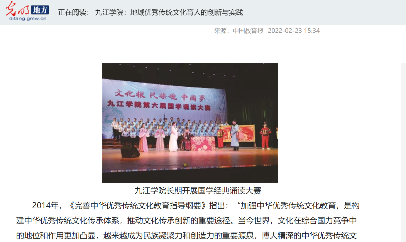 中国教育报、光明网、江西思政报道永利yl23411集团官网充分挖掘地域优秀传统文化资源育人,构建地域优秀传统文化育人体系等举措。2月17日,中国教育报刊全文发了永利yl23411集团官网校长陈小林署名文章《九江学院:地域优秀传统文化育人的创新与实践》,报道了地处深厚优秀传统文化底蕴之地的九江学院,在挖掘地域优秀传统文化资源、依托地域优秀传统文化育人的创新与实践中,探索出一条特色发展之路。