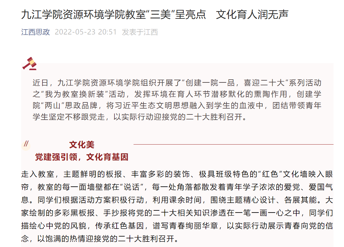 人民日报以《九江学院护理学生手舞<雪龙吟>》上好开学冬奥思政课》为题,浏览量达5.9万次数以上,报道永利yl23411集团官网护理学院为团结带领广大青年牢记党的教诲,立志民族复兴而开展的主题活动;江西思政以《学九江青年运动史传承江西红色基因——九江学院外国语学院举行党领导的中国青年运动史专题学习活动》《九江学院药生学院“青春心向党,喜迎二十大”博莱杯文体活动圆满收官》《九江学院资源环境学院教室“三美”呈亮点 文化育人润无声》和大江网以《九江学院资源环境学院教室“三美”呈亮点 文化育人润无声》为题,展现出永利yl23411集团官网引领青年学生坚定跟党走的信念,迎接二十大的胜利召开的各项校园文化活动。