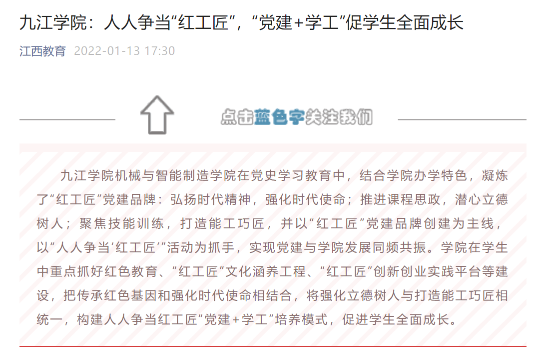 学习强国、江西日报、大江网、江西教育、江西思政等媒体以《党建领航 思政铸魂 立德树人》《九江学院旅游与地理学院着力打造党建品牌提升党建质量》《九江学院:人人争当“红工匠”,“党建+学工”促学生全面成长》《九江学院机械与智能制造学院:构建人人争当红工匠“党建+学工”育人模式,促进学生全面成长》等为题,重点报道了永利yl23411集团官网加强基层党组织建设,抓好学生红色教育、构建人人争当红工匠“党建+学工”培养模式,争创思政工作特色品牌,促进学生全面成长等方面的经验做法。