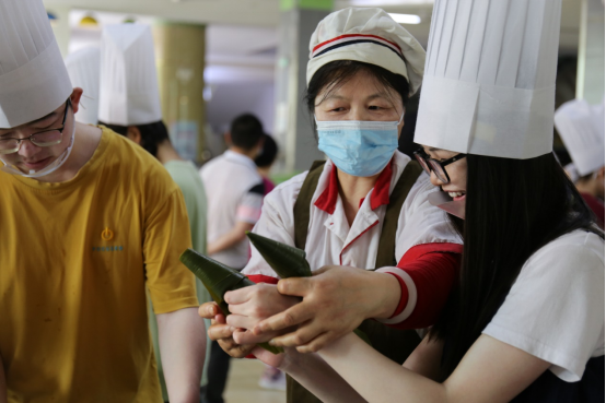 食堂阿姨更是“手把手”的传授如何包粽子,“粽子一定要包得紧实,做出来的才好吃。”食堂阿姨一边包一边叮嘱同学们。大家先将粽叶卷成漏斗状后,用筷子将馅料充实压紧,再用细绳一绕、一捆,一个个满怀情义的粽子很快就出现在面前。虽然大部分同学是第一次动手包粽子,包出来的粽子形态各异,并不“完美”,但现场其乐融融,充满着欢声笑语。