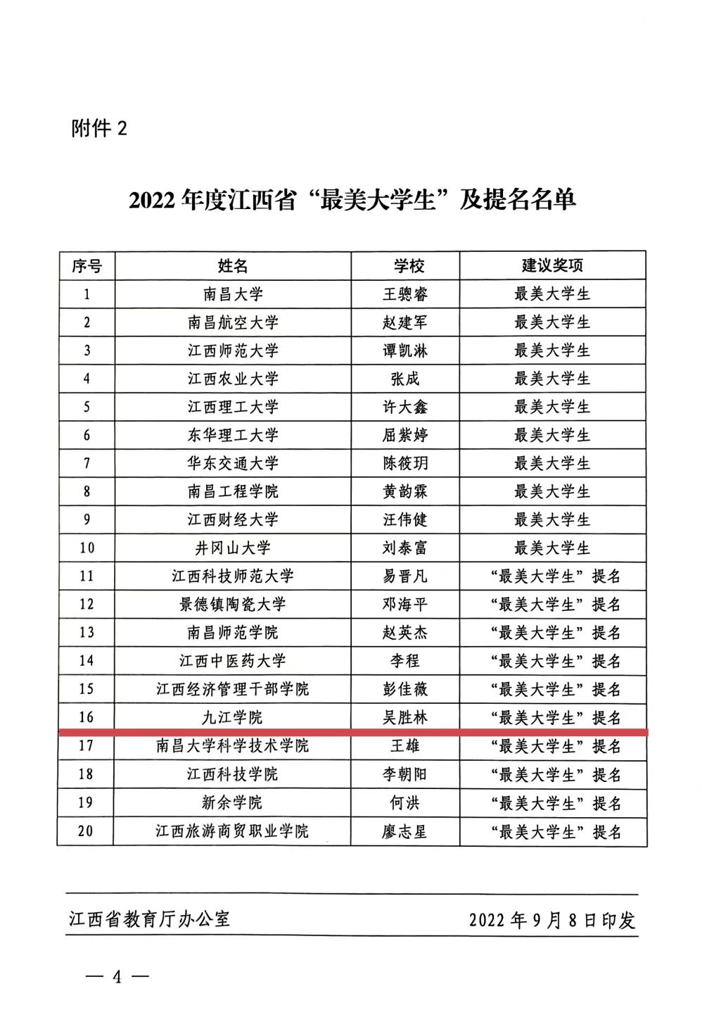 近日,中共江西省委宣传部、中共江西省委教育工委、江西省教育厅联合下发了《关于公布 2022 年度全省高校“最美辅导员”“最美大学生”推选活动结果的通知 》,永利yl23411集团官网教育学院吴燕老师荣获2022年度高校“最美辅导员”称号,管理学院18级本科生吴胜林同学荣获2022年度 “最美大学生”提名奖。