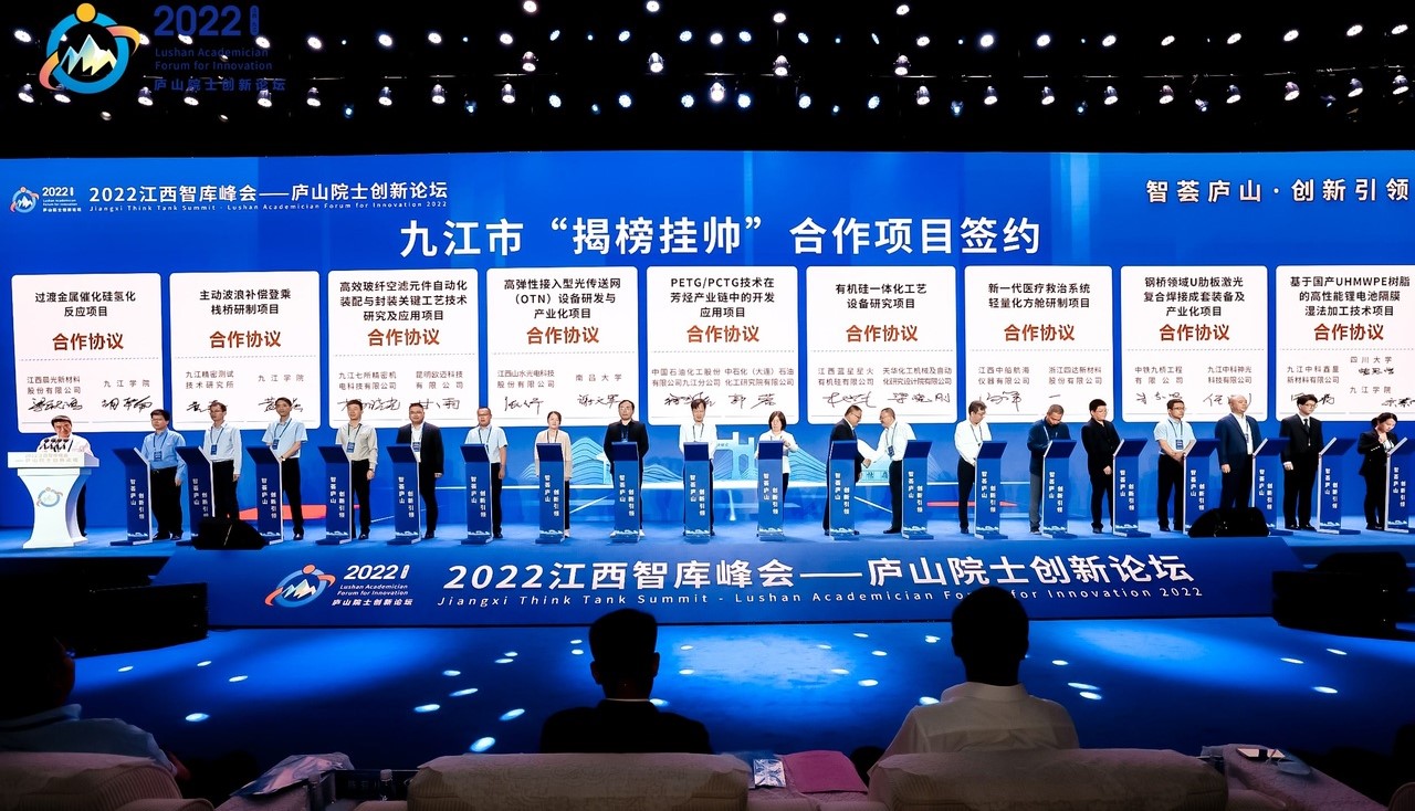 各产业学院深入企业大力开展技术攻关、产品研发、项目孵化、成果转化等工作,承担横向合作项目56项,经费合计2869万元,与企业共同获批江西省科技奖6项和中国发明创业奖成果奖、中国产学研合作创新成果奖5项,合作授权发明专利、实用新型专利80多件,帮助认定高新技术企业30多家,赋能并助推产业优化升级,为企业提高创新能力和增加经济效益作出了贡献;特别是在关键技术联合攻关方面取得了明显成效,2022年在我省举办的庐山院士创新论坛上成功揭榜九江市首届科技重大技术需求“揭榜挂帅”项目2项(全市共9项),总经费220万元。
