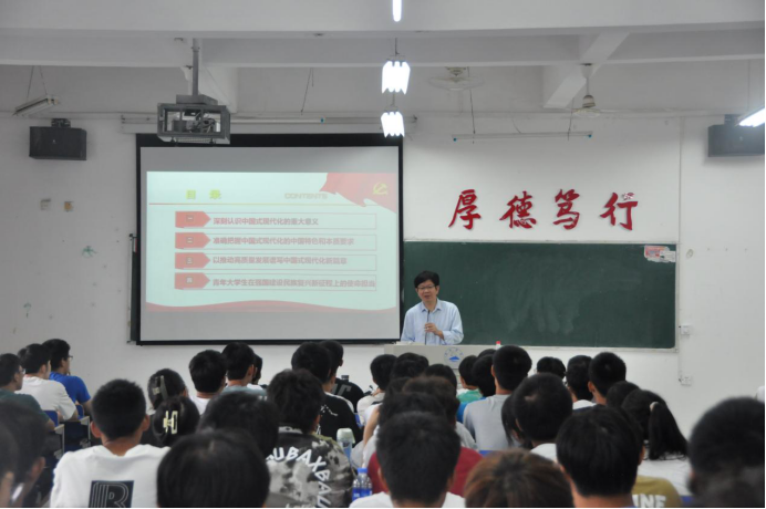 在逸夫图书馆报告厅,校党委书记李明斌以“以中国式现代化推进中华民族伟大复兴——深入学习贯彻党的二十大精神”为主题,为机械与智能制造学院A2321、A2322班同学上了一堂精彩生动的开学第一课。他从准确把握中国式现代化的中国特色和本质要求、深刻认识中国式现代化的重大意义、以推动高质量发展谱写中国式现代化新篇章、青年大学生在强国建设民族复兴新征程上的使命担当等四个方面展开讲授,并重点围绕深入学习贯彻党的二十大精神,和同学们进行深入交流。