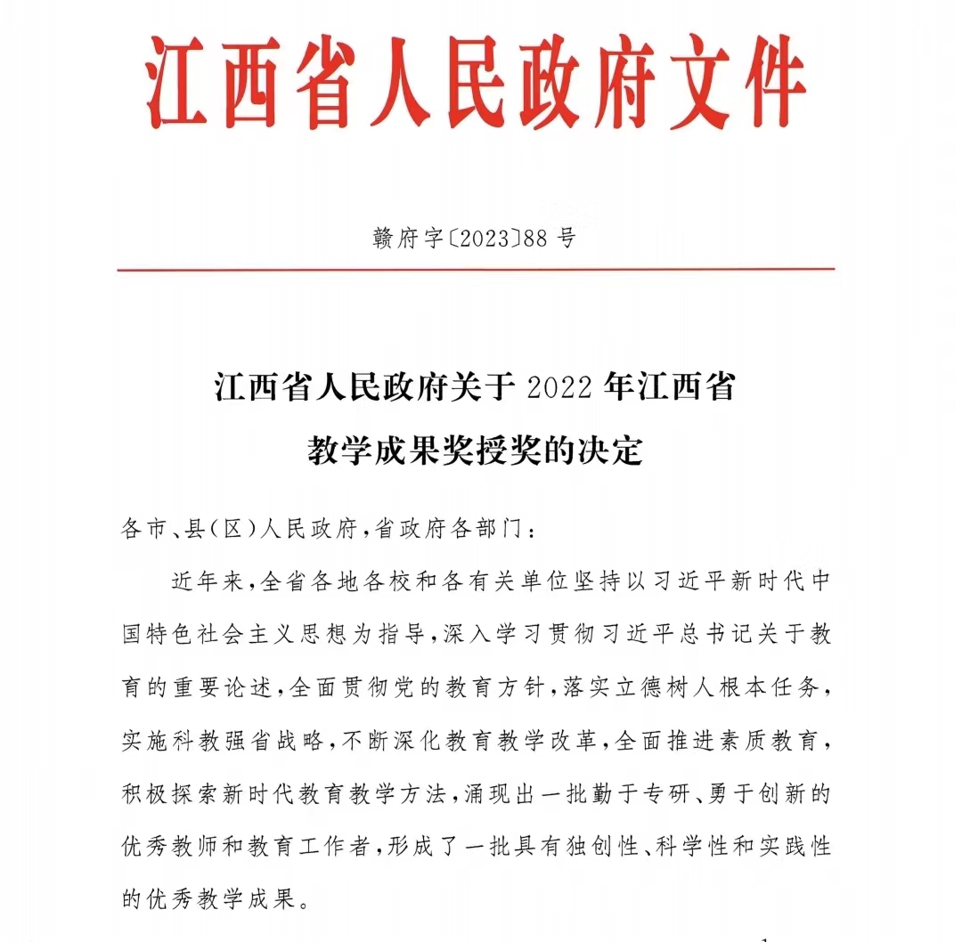 2023年12月29日,江西省人民政府《关于2022年江西省教学成果奖授奖的决定》(赣府字〔2023〕88号)发布,永利yl23411集团官网共有5项教学成果获奖。其中,以第一完成单位获得高等教育类(本科层次)一等奖2项、二等奖1项,基础教育类一等奖1项;以第二完成单位获得研究生教育类二等奖1项。