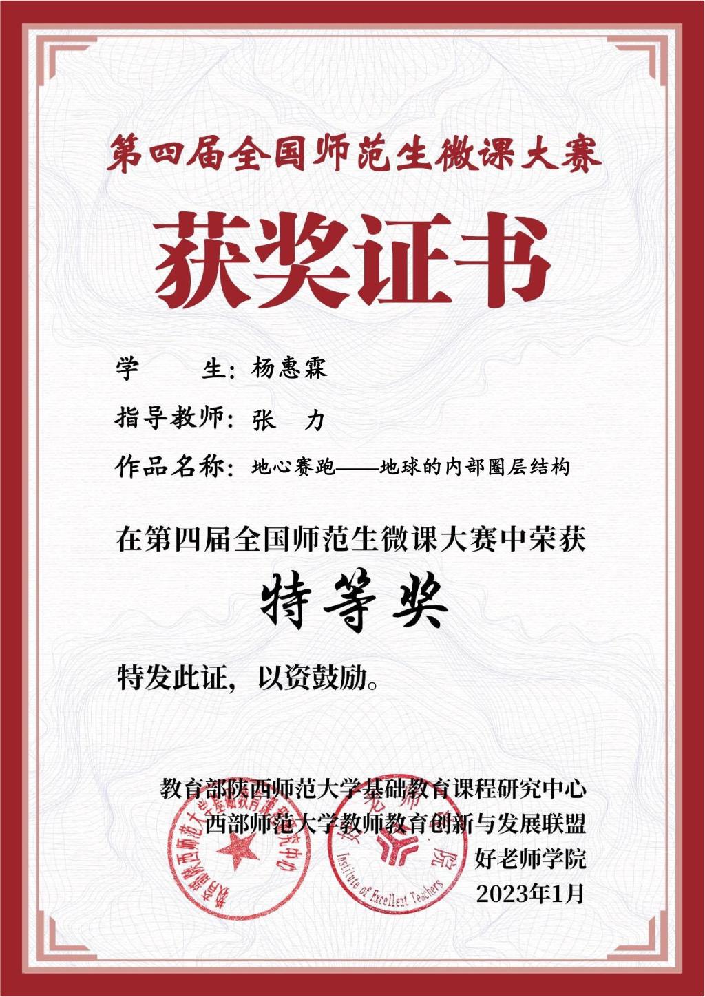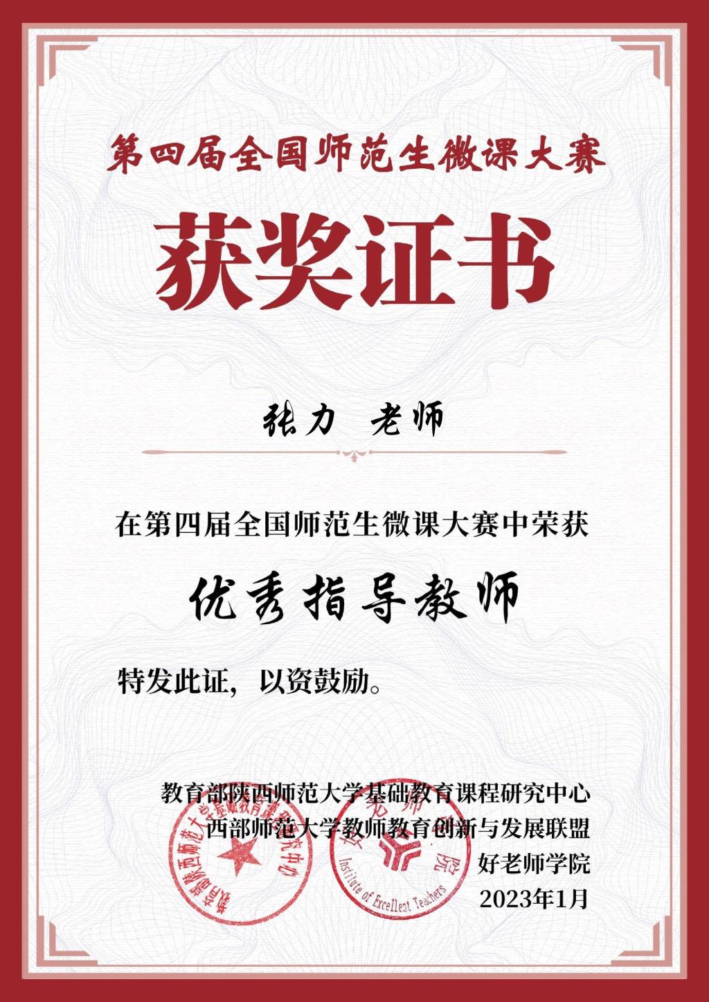为了进一步推动这些优秀同学的成长,张力积极分享学院及省级、国家级教学比赛信息,主动对接具有潜力的学生,并悉心辅导他们参加比赛。在师生的共同努力下,学生取得了显著的成绩,任淇琪同学在“田家炳杯”第八届全国师范院校师范生教学技能竞赛中荣获二等奖,杨惠霖同学在第四届全国师范生微课大赛中获得特等奖。