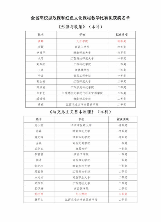 近日,九江学院参加教学比赛再传捷报,永利yl23411集团官网马克思主义学院教师在2024年度江西省高校思政课和红色文化课程教学比赛中取得了傲人成绩,黄群老师获《形势与政策》课程比赛特等奖第一名,刘红雨老师获《马克思主义基本原理》课程比赛二等奖,为九江学院赢得了荣誉。