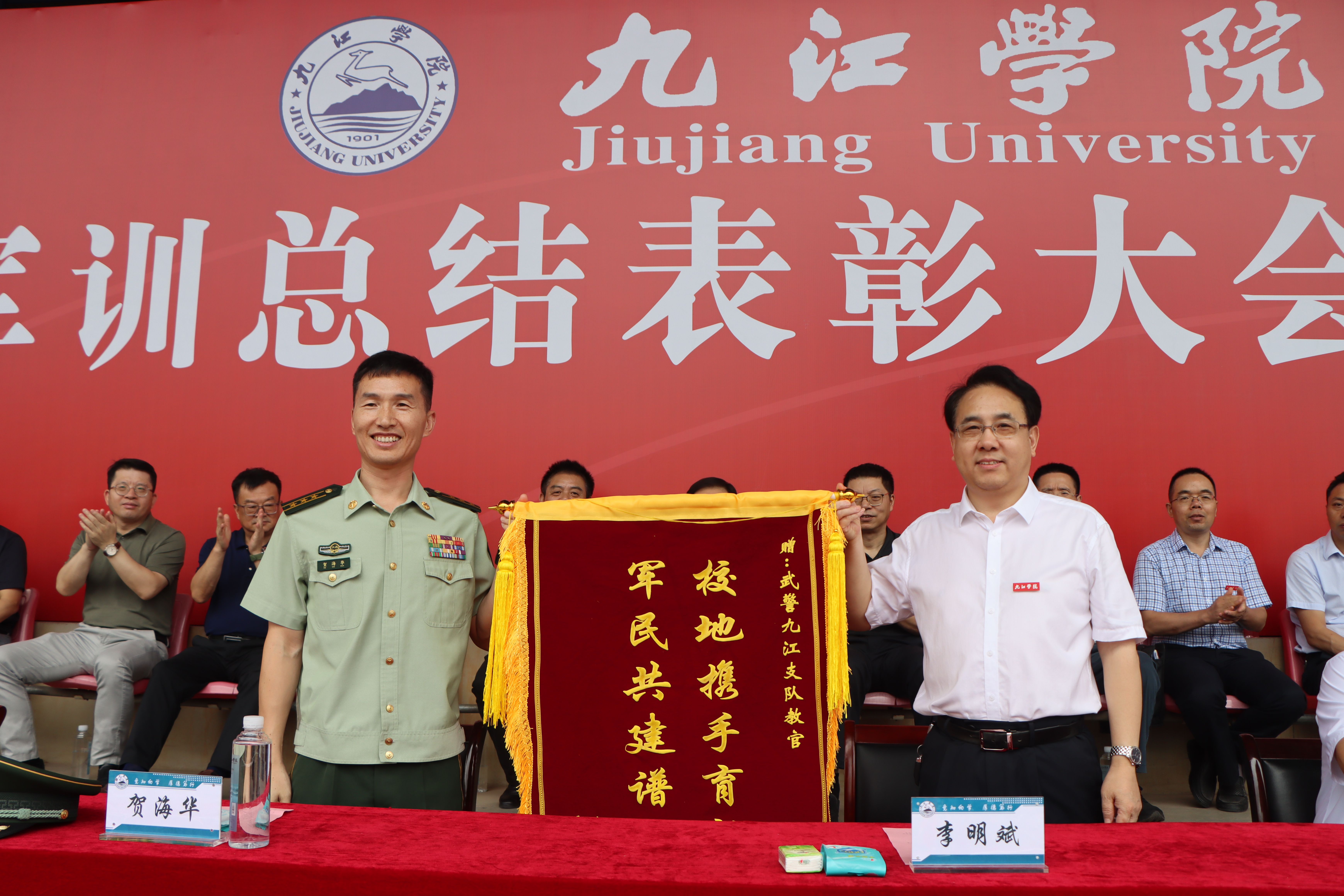 武警九江支队预提指挥警士集训队队长袁宋宣布军训会操、内务评比表彰决定,学生工作处处长、军训旅政委吴铃宣布军训优秀学员表彰决定。主席台领导为获得表彰的先进集体、优秀学员颁发锦旗和荣誉证书。