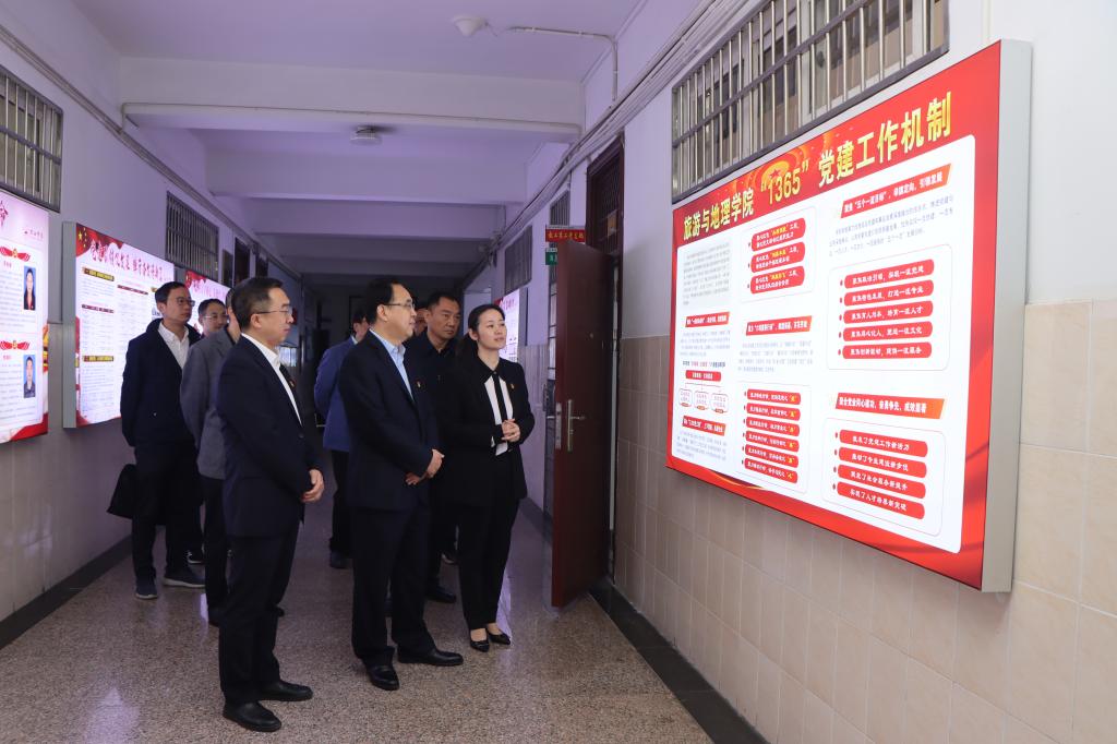 李明斌首先参观了旅游与地理学院党建与文化建设展示橱窗,走访了学院教工第二党支部党员活动场所,详细了解学院党建和文化建设情况。
