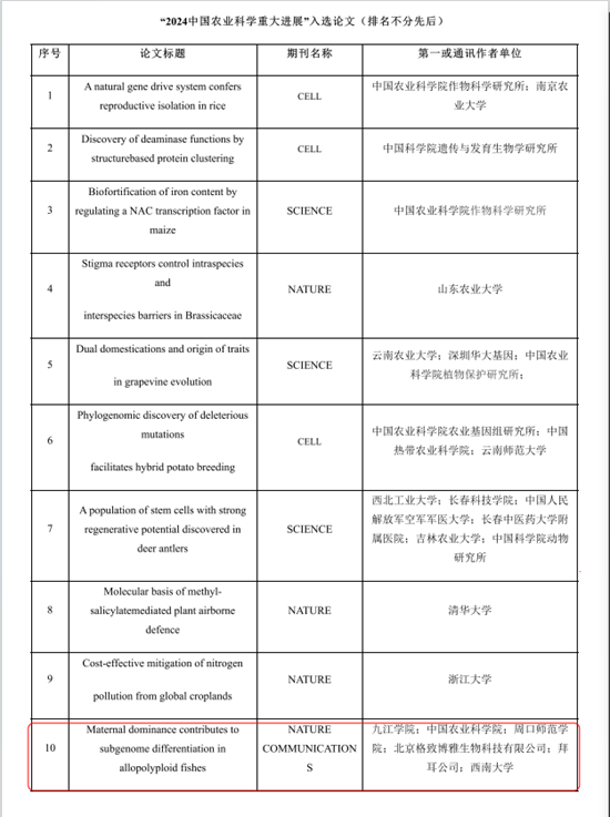 为充分展示我国农业科技原始创新能力,宣传我国农业领域的重大科学成果,加快推动我国农业高水平科技自立自强,中国农业科学院组织开展了“2024中国农业科学重大进展”论文评选工作。此次评选按照“前沿引领、开创卓越、重大突破”的原则,以2023年度Web of Science收录的农业领域中国学者以第一或通讯作者发表的2295篇高水平论文为基础,经过初选、专家遴选和院士终审等环节,最终遴选出10篇能够充分代表2023年我国农业科技前沿、取得突破性进展的基础性研究成果。2024年12月,这些成果将以中国农业科学重大进展的形式,在《2024中国农业科技发展论坛暨全球农业研究热点前沿与科技竞争力成果发布会》上面向全球发布。