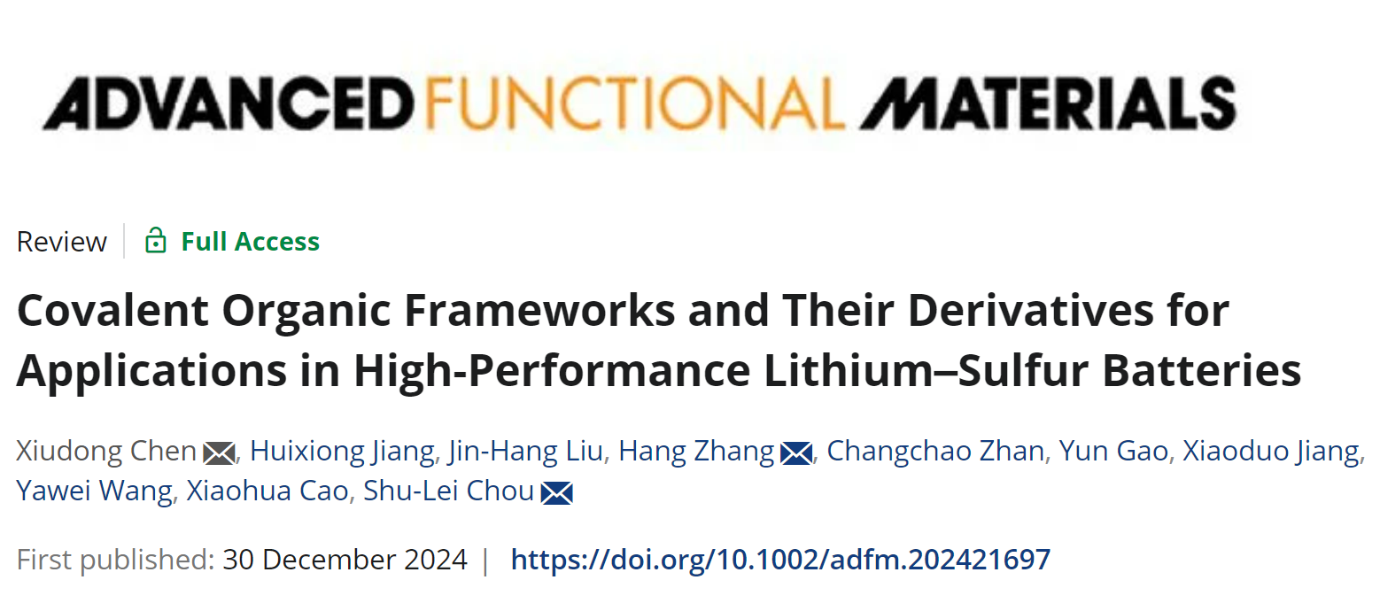 近日,九江学院化学化工学院陈修栋教授团队与温州大学侴术雷教授团队合作在《Advanced Functional Materials》(先进功能材料)上发表题为“Covalent Organic Frameworks and Their Derivatives for Applications in High-Performance Lithium-Sulfur Batteries”的综述性学术论文。这是永利yl23411集团官网首次以第一单位在《Advanced Functional Materials》发表学术论文。
