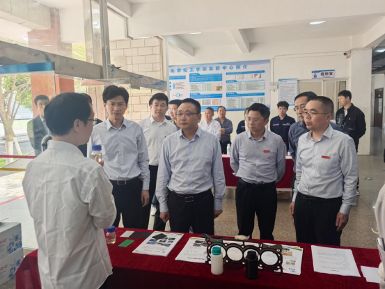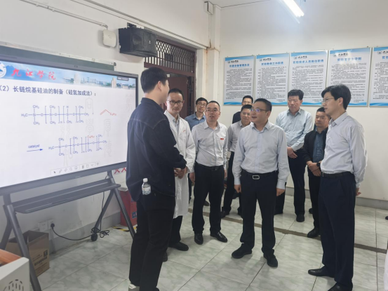 在化工实验楼,黄强实地考察江西省重点现代产业学院——有机硅新材料产业学院及能源循环校企联合创新实验室的建设与运行情况,详细了解产业学院建设成效及产学合作科研成果,并听取校企合作中的实际困难。他充分肯定了永利yl23411集团官网在有机硅新材料产业学院建设方面取得的成绩,并鼓励进一步推动政校企深度融合,充分发挥现代产业学院在重点产业链高质量发展中的关键作用,为企业精准输送产业技术人才,解决关键技术问题,为高标准高质量建设长江经济带重要节点城市发展提供更强有力的人才和科技支撑。