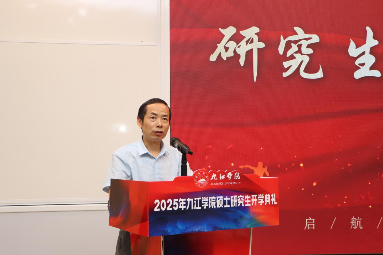 典礼上,李明斌首先向来自全国23 个省份、50 多所高校的新研究生表示欢迎,强调多元化的生源背景将为校园注入新的活力。在回顾学校办学历史时,李明斌指出,九江学院溯源于1901年创立的但福德医院护士学校,2002年由四校合并升格为本科高校,2024年成功获批硕士学位授予单位,生物与医药、资源与环境、国际商务三个学位点成为首批硕士授权专业。目前,学校正紧紧围绕更名大学的目标强化学科建设,已有10个学位点达到申硕条件,研究生教育体系日益完善。他还特别介绍了学校在科研与社会服务方面取得的显著成绩,包括荣获3项国家级行业科技奖、2024年以来科研与社会服务到账经费突破1亿元,并拥有重组后的省级重点实验室和10个国家级科技小院等高层次平台,为研究生学术研究与实战能力提升提供了坚实支撑。