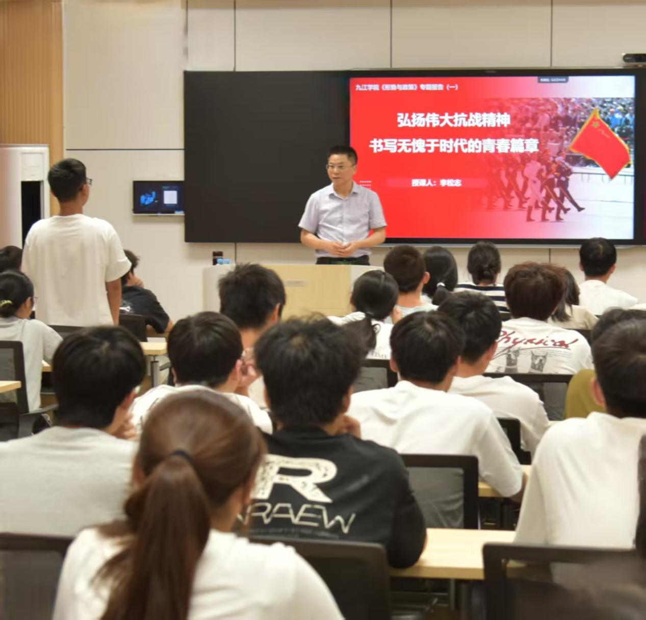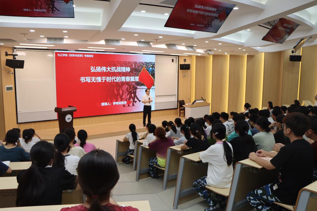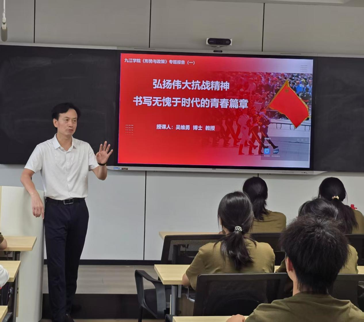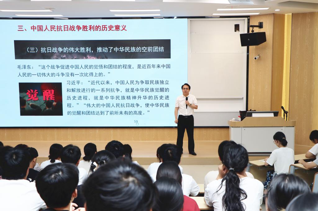 课堂上,李明斌以纪念中国人民抗日战争暨世界反法西斯战争胜利80周年大会为切入点,带领学生重温习近平总书记在纪念中国人民抗日战争暨世界反法西斯战争胜利80周年大会上的重要讲话,观看九三胜利日阅兵精彩瞬间,通过大量详实数据和生动案例,系统讲述了中国人民抗日战争的历史进程、中国共产党的中流砥柱作用、中国人民抗日战争的历史意义、抗战精神的历史启示和时代价值,勉励大学生传承弘扬伟大抗战精神,涵养家国情怀,筑牢爱党爱国、立志报国的思想根基。