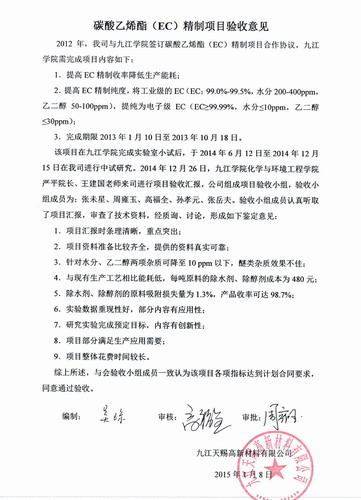 2014年12月26日上午,江西省高等学校科技落地计划项目“6000t/a锂电池动力电池材料碳酸乙烯酯精制的关键技术及应用”中试验收汇报会在九江天赐高新材料有限公司进行。企业方成立了由高级技术顾问、常务副总经理、项目部负责人、电池车间负责人等组成的验收小组,我院项目组核心成员、参与研究的学生参加了验收会。