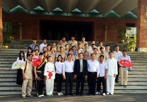 来自九江学院的公派教师张文峰通过精心准备的幻灯片向在场嘉宾及学员一一展示并生动讲解了中国传统节日,春节、清明节,并将中国的传统节日与柬埔寨的相关节日作比较,让学员们更加直观地了解了中国文化。孔子学院汉语教师志愿者宋亚洲、朱赞赞、王虎(柬方)共同展示了中国功夫。