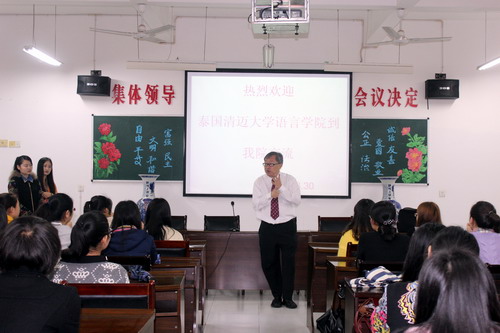 上午8点30分,交流活动正式开始。马院长对前来参加交流活动的有意愿到清迈大学做交换生的同学进行了一次宣讲。他首先详细介绍了清迈大学的基本情况、师资力量、学生培养、学科专业概况等方面的情况,同时还特别提到清迈大学语言学院的对外合作办学模式灵活多样,有很好的教学培养模式,是一个非常不错的学习语言的国际环境。同学们对参与此次交流会的积极性也很高,纷纷就自己关心的问题向马院长进行了咨询,马院长一一耐心地向同学们作了解答。